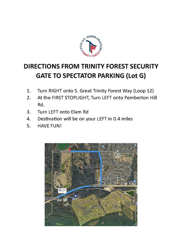 - Player Parking - Players will park in the lower lot of Trinity Forest Golf Club (Lot E). There will be shuttles available for transportation up to the Clubhouse. Carpooling is recommended for caddies and family.